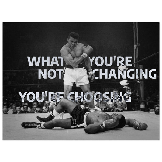 This poster embodies resilience, determination, and the will to win. Featuring Muhammad Ali, one of the greatest athletes of all time, it serves as a powerful reminder that every decision—or lack of change—is a choice.
