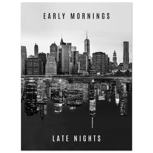 This poster captures the essence of ambition, dedication, and the relentless pursuit of success. The contrast between "Early Mornings" and "Late Nights" symbolizes the hustle that many entrepreneurs, business professionals, and dream chasers experience daily.